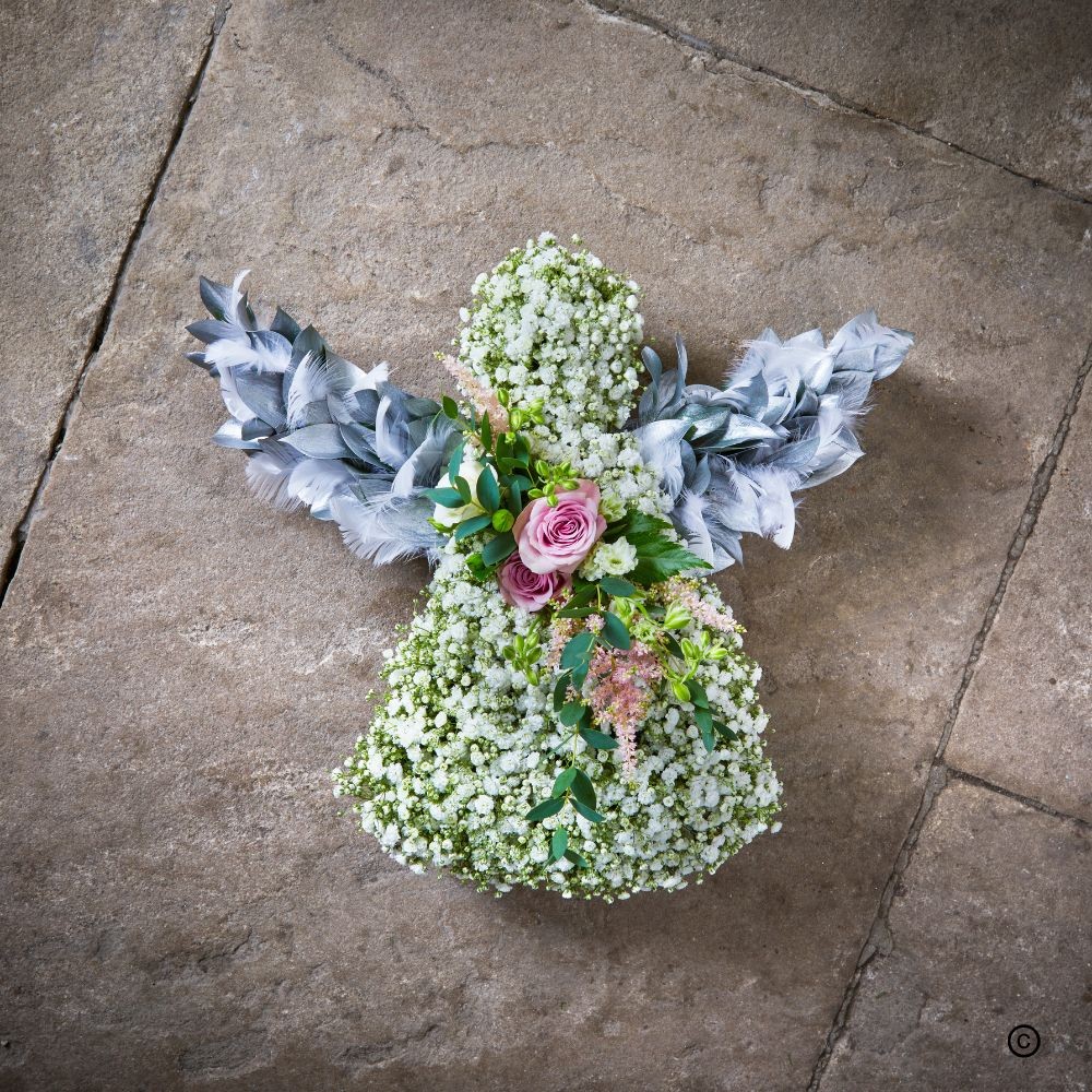 Another angel made in heaven, this tiny angel made of frothy gypsophila with feather wings and a rose heart, will support you at this overwhelming time. Reminiscent of angels looking over and protecting a beloved child.